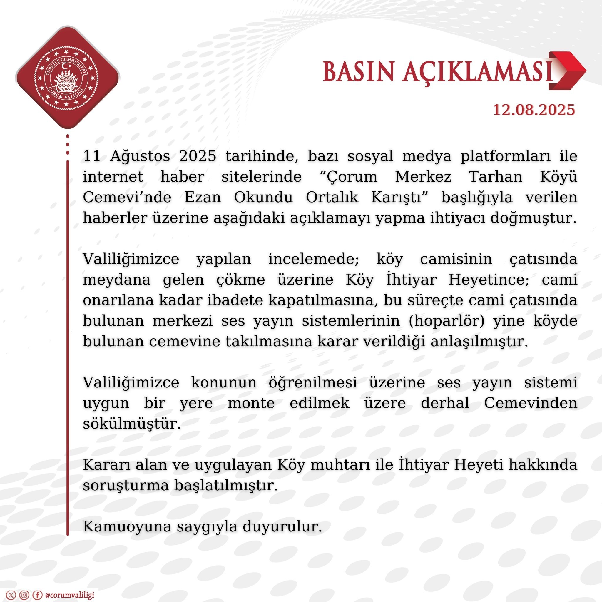 “11 Ağustos 2025 tarihinde, bazı sosyal medya platformları ile internet haber sitelerinde ‘Çorum Merkez Tarhan Köyü Cemevi’nde Ezan Okundu Ortalık Karıştı’ başlığıyla verilen haberler üzerine aşağıdaki açıklamayı yapma ihtiyacı doğmuştur.