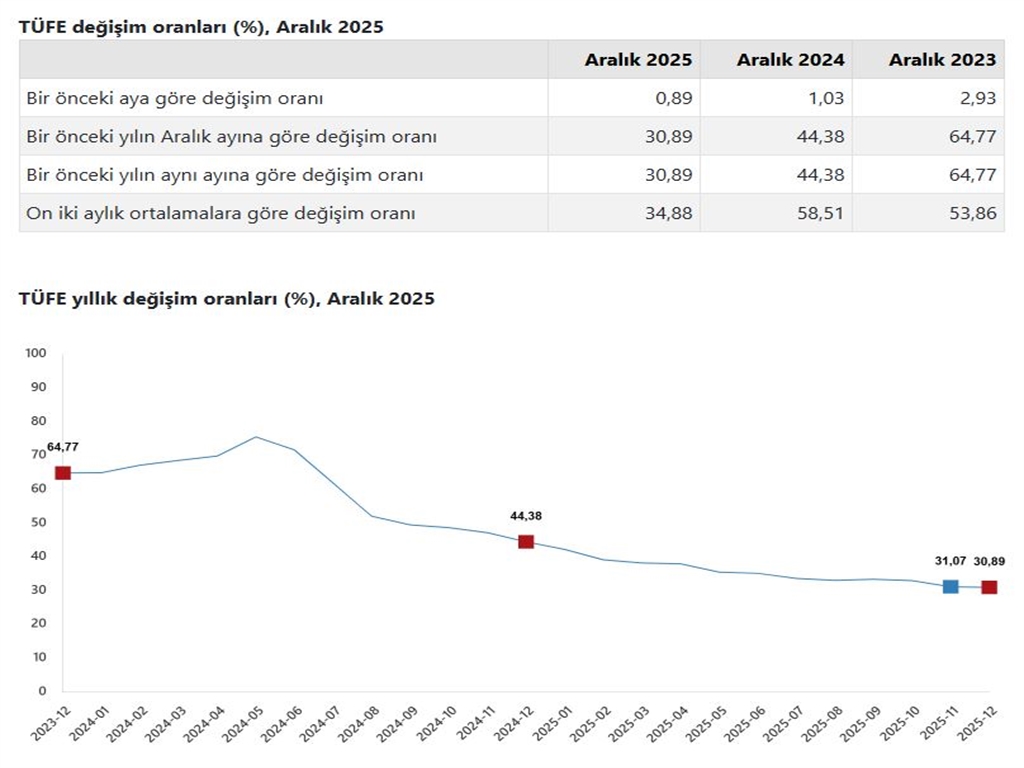 Yurt içi üretici fiyatlarına bakıldığında, aralık ayında bir önceki aya göre %0,75, bir önceki yılın aynı ayına göre %27,67 ve 12 aylık ortalamalara göre %25,36 artış görüldü.